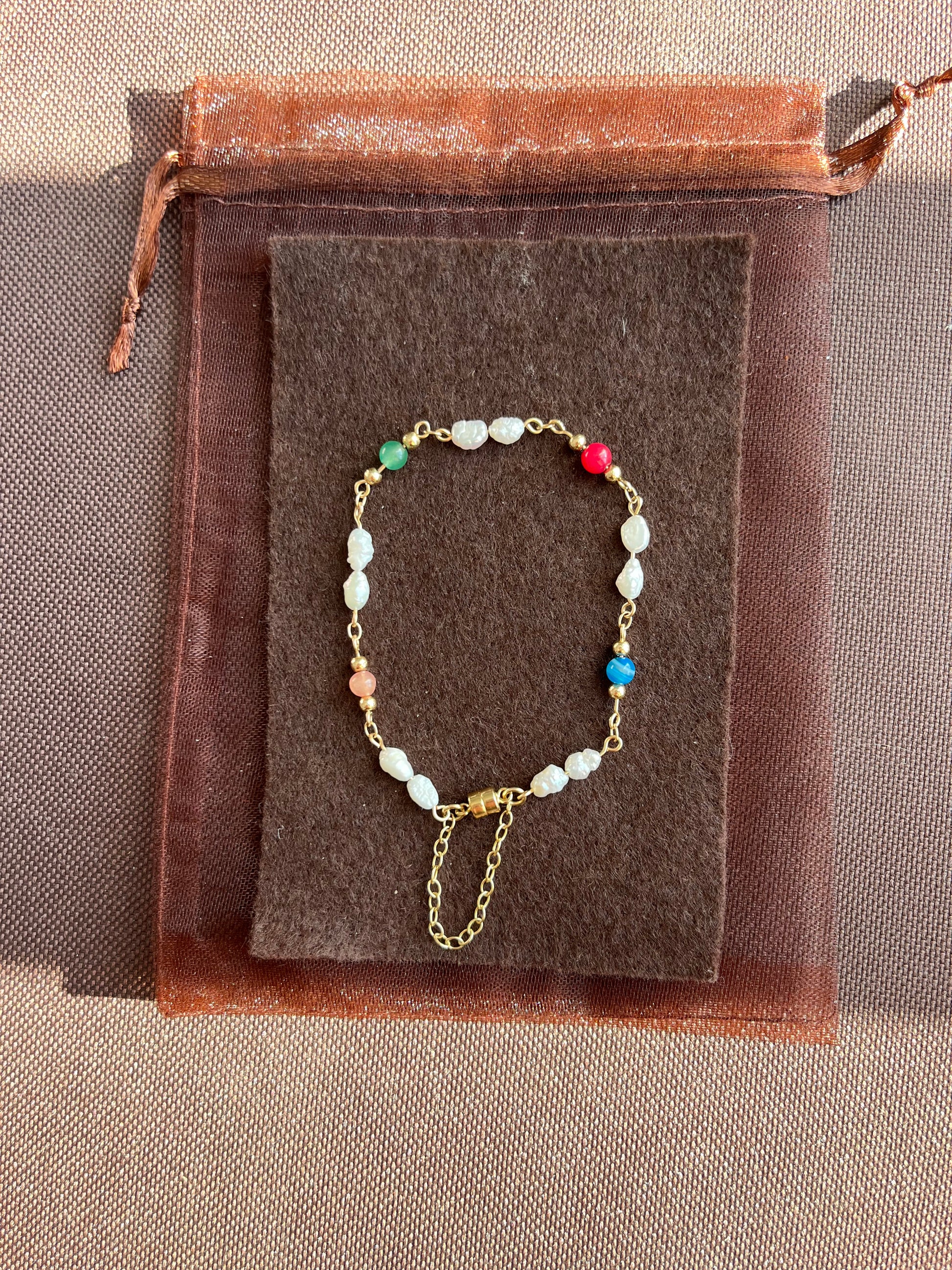 Composé d’une chaîne en or rempli 14k, il mêle harmonieusement des perles blanches délicates, des billes colorées et des touches dorées, symbolisant la créativité, la joie et l’élégance.
