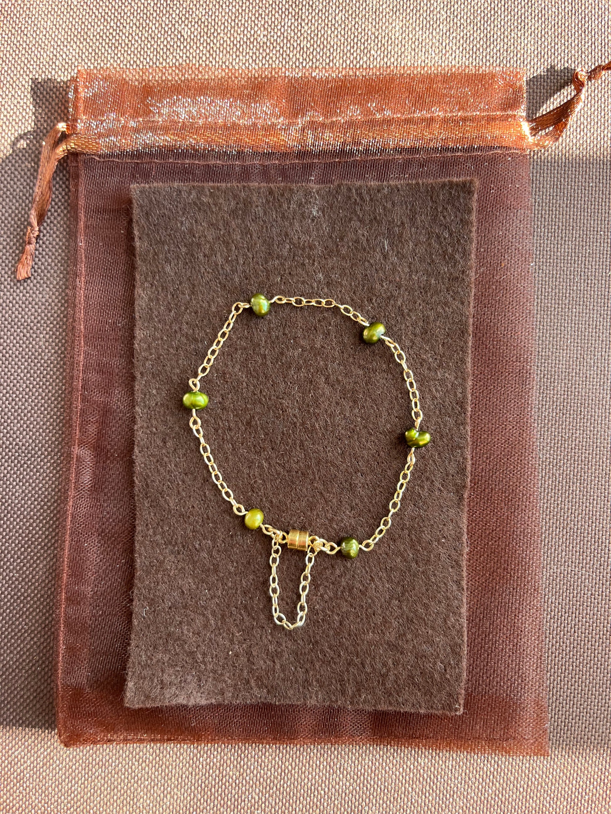Le bracelet Forêt est composé d’une chaîne en or rempli 14k ornée de perles vertes aux reflets nacrés. Chaque perle capte la lumière avec élégance, évoquant la beauté naturelle de la forêt.
