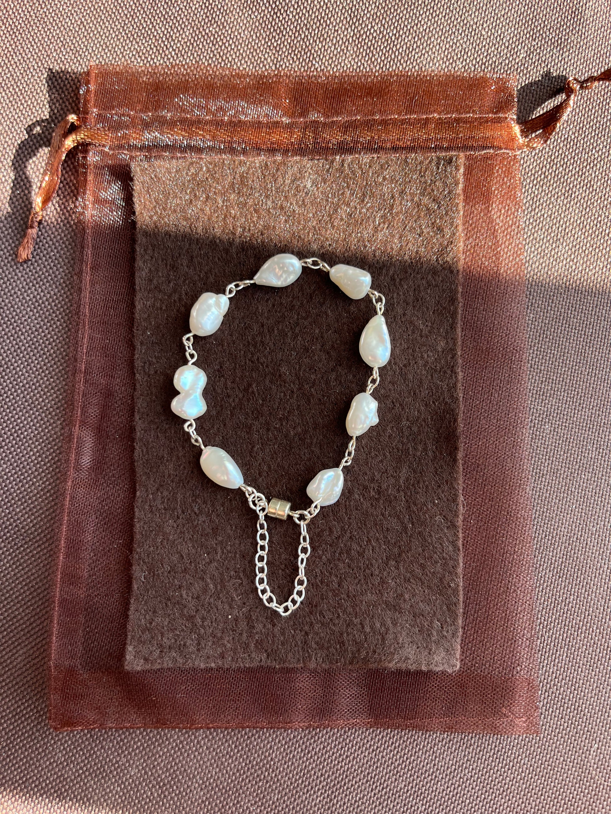 Bracelet “Marguerite” Élégant et intemporel, le bracelet Marguerite marie la douceur des perles d’eau douce ( environ 6-7 mm) au froid de l’argent sterling 925. Son fermoir magnétique discret et sa chaîne de sécurité assurent une tenue fiable au quotidien, tout en facilitant l’attache.