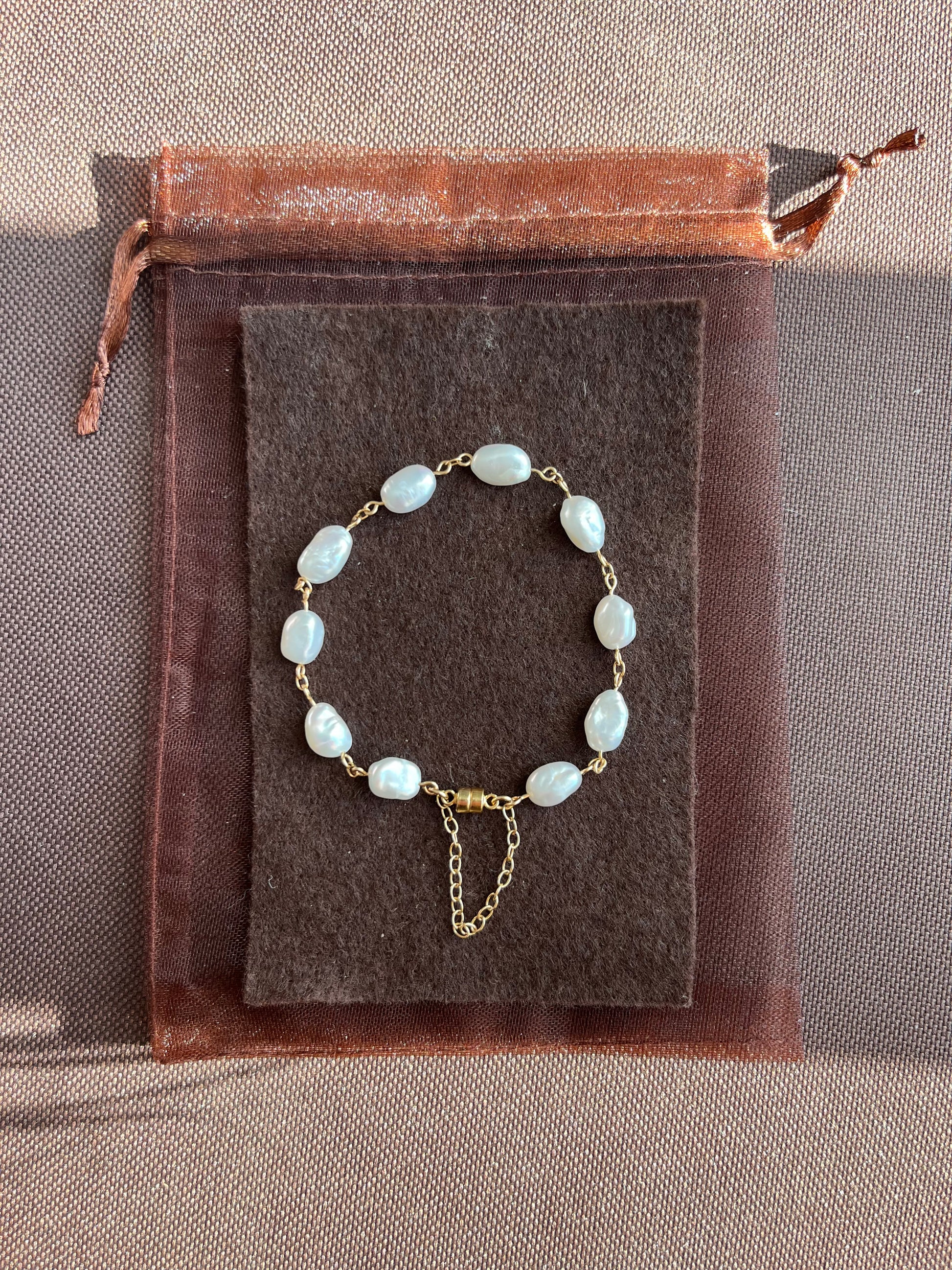 Bracelet “Marguerite” Élégant et intemporel, le bracelet Marguerite marie la douceur des perles d’eau douce ( environ 6-7 mm) à la chaleur de l’or rempli. Son fermoir magnétique discret et sa chaîne de sécurité dorée assurent une tenue fiable au quotidien, tout en facilitant l’attache.